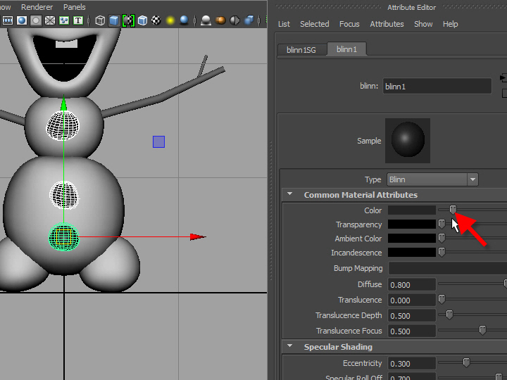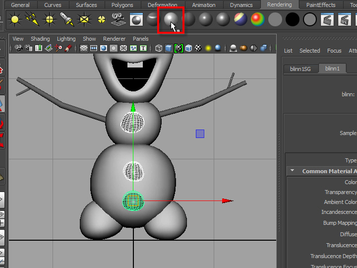上の図のように、光沢のあるマテリアル(Blinn)を貼り付けます。