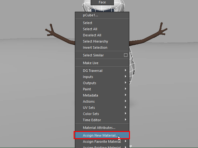 雪だるまの頭部、ボディー、足をセレクトし、マウス右ボタンで Assign New Material を選択します。