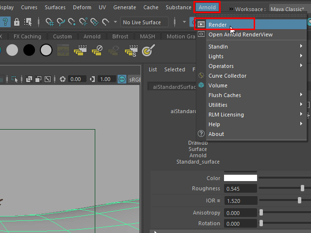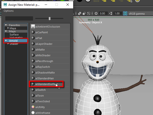 それにはまず、aiStandardSurface という Arnold のマテリアルをアサインします。