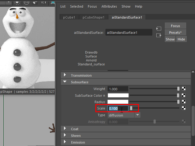 これを解決するには、雪だるまを大きくするか、またはSubsurface のScaleの数値を小さくします。
