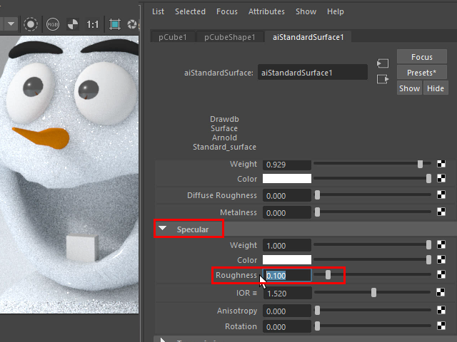 Subsurface のWeight を1.0 まで上げると、光が物体の中を通り抜け、雪の質感が出ます。