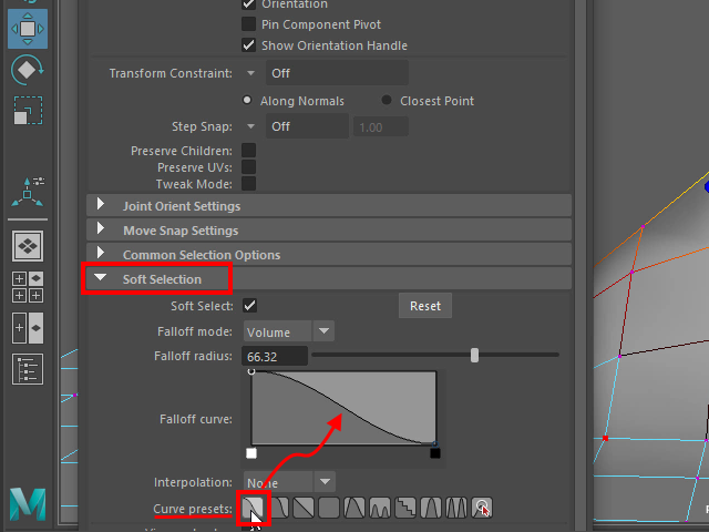 Soft Selection の Curve presets から一番左のアイコンをセレクトします。