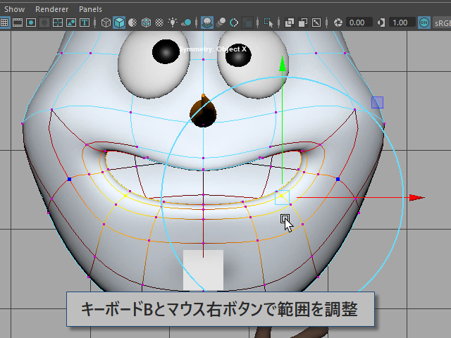キーB を押した状態で、右ボタンで影響を受ける範囲を調整します。
