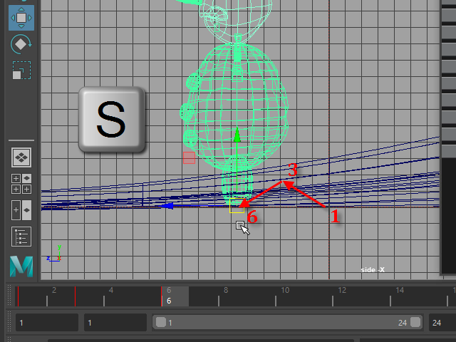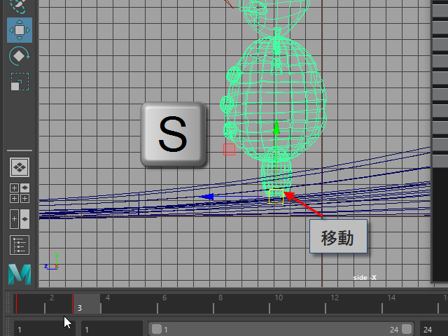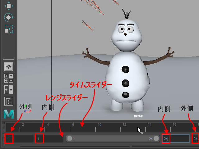 外側の数値は全体のフレーム数(コマ数)で、内側の数値はタイムスライダーに表示される範囲です。