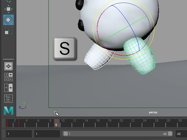 3. 9 フレーム目で右脚を前に回転させ左脚を後ろに回転させ、キーを入れます。