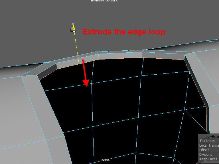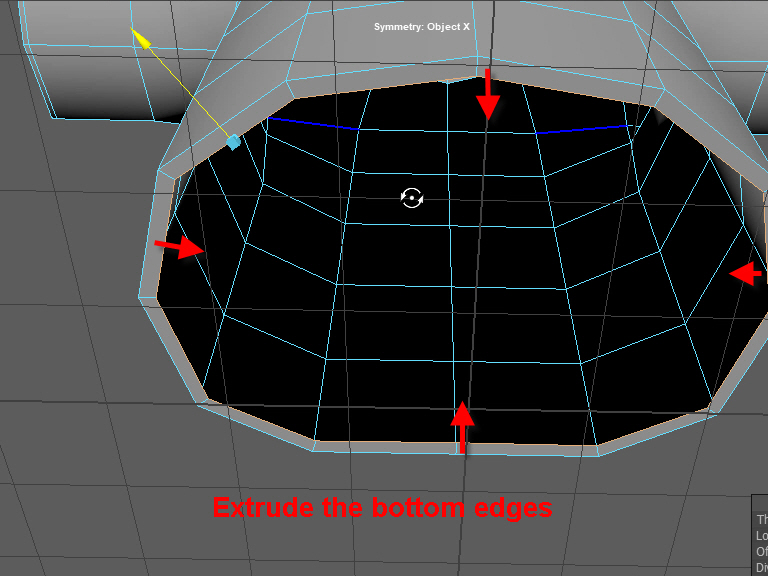 さらにもう一度 Extrude し、青の矢印で内側の面を制作します。