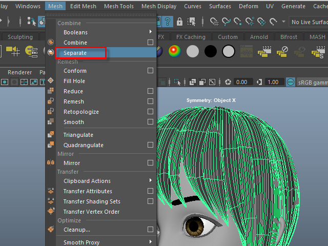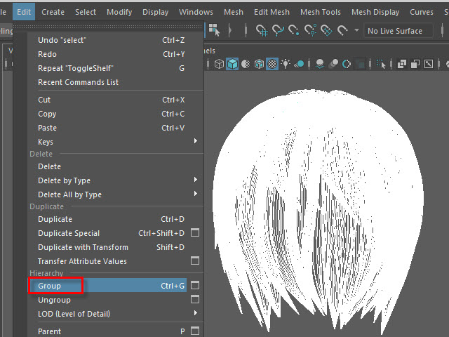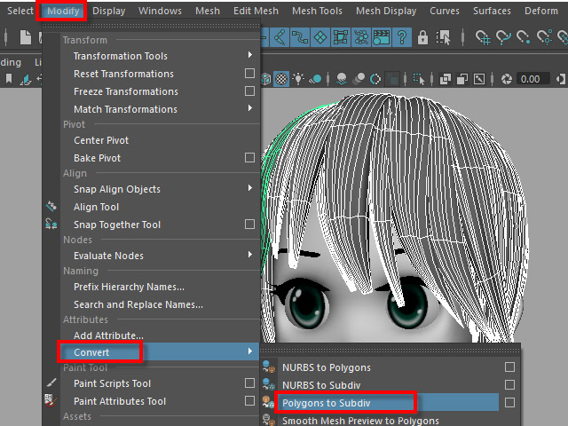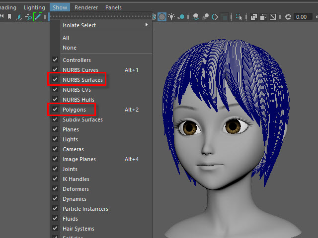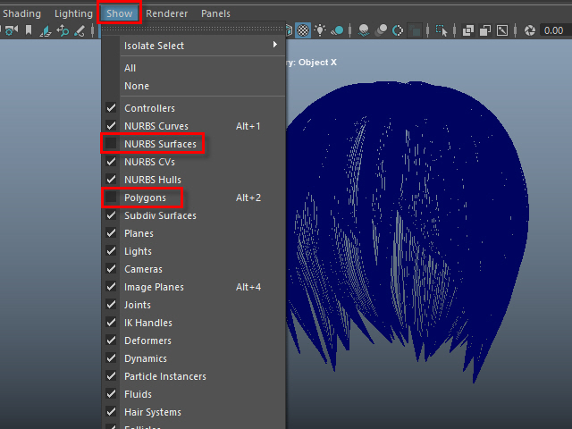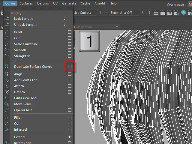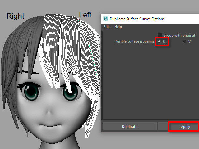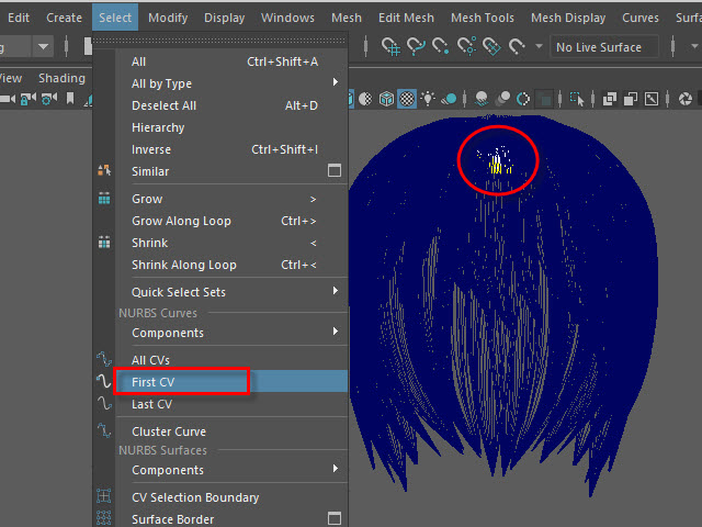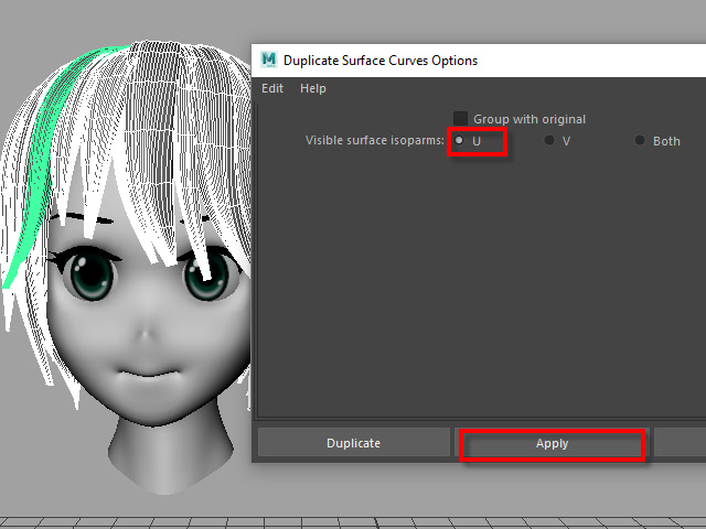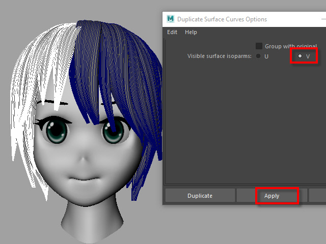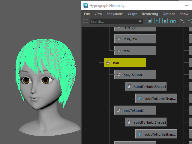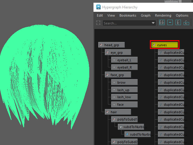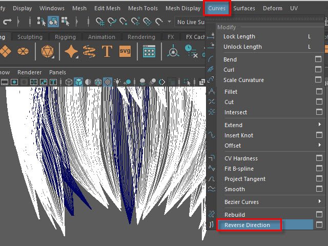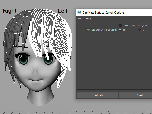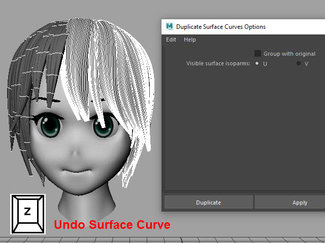 ____________________________________________________ How to Make Multi-Curves ____________________________________________________ 0. ![]() If the hair is combined, separate them. もし髪全体がCombine されてる場合は、Separate で分けます。 1. ![]() To extract curves from polygon, first convert to Subdiv. 髪をセレクトし、Subdiv に変換します。 2. ![]() Then, convert to NURBS. 次に、Subdiv から NURBS に変換します。 3. ![]() If the hair turned into solid green, there is no shader assigned. Assign a new shader if there is no shader on the surfaces. NURBS に変換すると、色がグリーンになります。 これはシェイダーが張り付いてない状態です。 新た に シェイダーを張り付けます。 4a. ![]() Select the all nurb hairs and hit 1 before extracting curves at the next step. 次のステップでカーブを抽出する前にキー1で表示します。 4b. ![]() To extract curves, go to Duplicate Surface Curves > Option Make sure the nurb hairs are displayed with key1. If you displayed with key3, they will create too meny curves. 次に、カーブを抽出してみます。 まず髪をセレクトし、Duplicate Surface Curves のオプションをオープンします。 キー1で表示されていることを確認します。 キー3で表示すると 必要以上にカーブが複製されてしまいます。 5. ![]() Select U direction and apply. U 方向に抽出してみます。 6. ![]() The right side hairs are wrong direction. It happens when you duplicate and flip the hair tubes. 白くなっている部分が抽出されたカーブですが、このように、右と左で方向が違う場合があります。これは最初に円柱で髪を制作した時に、片側の髪を制作し、それを反転したために起こる現象です。 7. ![]() Undo まずUndo で取り消し、右側と左側を分けて別々に抽出してみます。 8. ![]() Select the left side hairs and apply. まず左側 (Left ) の髪をセレクトし、U方向に抽出します。 9. ![]() Now, select the right side hairs. Change to V direction and apply. 次に右側をセレクトし、V 方向に抽出します。 10. ![]() A curve has a direction. Make sure the square dot is the beginning of the curve. Before applying nHair on the curves, all curves directions need to be checked. カーブの方向性について カーブにはこのように方向があります。 カーブの起点は四角いバーテックスになっています。 このカーブの方向を間違うとnHair がうまく作成されません。 11. ![]() Hide NURBS Surfaces and Polygons. NURBS Surfaces と Polygons を非表示にします。 12. ![]() Select all curves and apply First CV. カーブをすべてセレクトし、First CV をクリックします。 13. ![]() The first square CVs will be displayed. If you see the square CVs on tip of the hair, they need to be reversed direction. If the square CVs are gray, turn off Symmetry. このように四角いCVが表示されます。 毛先に四角いCVが表示されている場合は、カーブの向きを反転します。 四角いCVがグレー色で表示される場合は左右対称(Symmetry)を off にします。 14. ![]() Select all curves which are the wrong direction. 向きが逆になっているカーブをすべてセレクトします。 15. ![]() Apply Reverse Direction. Reverse Direction でカーブの向きを反転します。 16. ![]() Apply First CV again and make sure all directions are correct. もう一度 First CV を適用し、カーブの向きを確認します。 17. ![]() Select all curves and Group them. すべてのカーブをセレクトし、グループ化します。 18. ![]() Rename it. 名前を変更します。 19. ![]() Display everything. 表示を元にもどします。 20. ![]() You don't need the hair tubes anymore. Hide or delete them. ヘアーチューブはこれ以上必要ないので、削除するか、または非表示にします。 21. Now it is ready to apply Maya nHair.