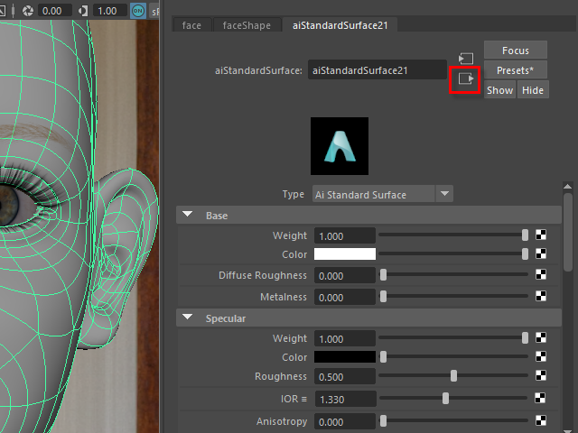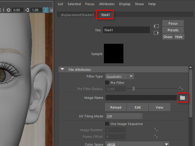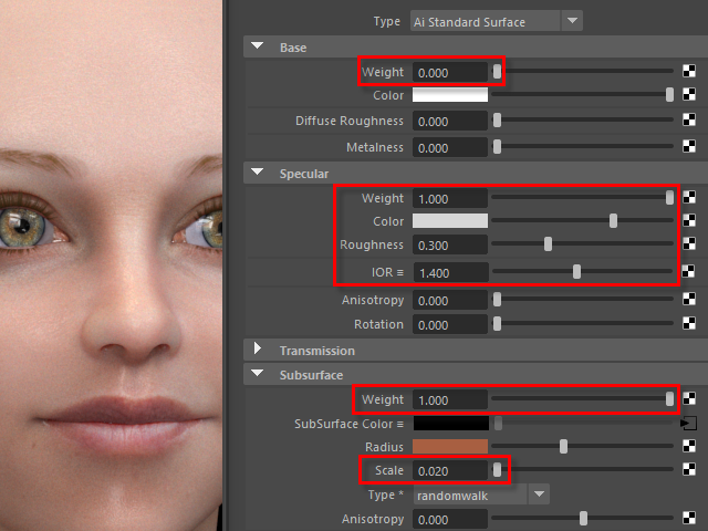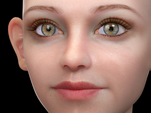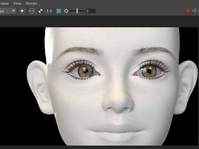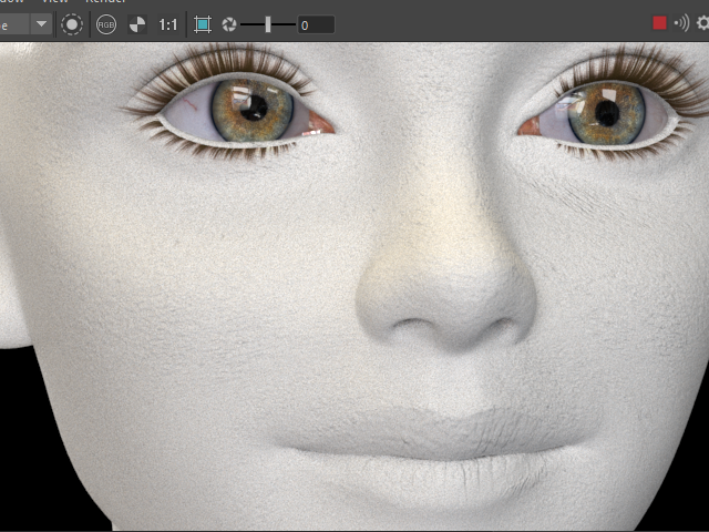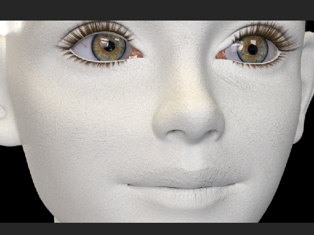 8. Displacement Map ディスプレイスメント マップ 1. ![]() I am going to make details such as small wrinkles and skin pores with a displacement map. First, I am going to turn off the color map temporally so I can see skin pores clearly. Turn off Weight. displacement map で小ジワや毛穴を作成してみます。 まず、一時的にカラーマップをオフにし、毛穴がよく見える状態にします。 Wight を 0 に下げます。 2. ![]() Next, apply white on Base color. 次に、Base の色を白くします。 3. ![]() It's going to be like this. このようになります。 4. Save blue channel in Photoshop.It's going to be a displacement map. フォトショップで blue channel を保存します。 この画像から displacement map を制作します。 5. ![]() Get rid of the hair and delete sharp lines from the ears. Try not to blur the skin texture. Keep the skin details as possible. 髪の毛を削除し、耳のシャープな線をすべて消します。 ![]() Get rid of dark area between lips. Draw over the wrinkles and enhance the contrast. 唇の間の濃い影を消します。 唇のシワを描き起こし、コントラストを明確にします。 ![]() Close the eyes. 目を閉じます。 6. ![]() To apply a displacement map, click the icon which is on top right. displacement map の張り付けは右上のアイコンをクリックします。 7. ![]() Click the icon. 8. Go to File. 9. ![]() Click the folder icon. 10. ![]() Open displacement map. 11. ![]() Test Rendering. You will see like this because the scale of displacement map is too hight. レンダリングしてみると、こんな感じになります。 これは displacement のScale を調節する必要があります。 12. ![]() Adjust Scale. If you can not find the displacementShader window, open Hypershade and find it. Scale を調節します。 もし displacementShader ウィンドウがどこにあるか分からない場合は、 Hypaershade からアクセスできます。 ![]() 13. ![]() Click file tub and turn on Alpha Is Luminance. file タブをクリックし、Alpha Is Luminance をオンにします。 14. ![]() Start rendering. It's going to be like this. To adjust the bumps, adjust displacement Scale. See 12. レンダリングすると、このようになります。 皮膚の凹凸は、 displacement の Scale で調節します。 12. の解説を参考。 15. ![]() If entire face is inflated or deflated, adjust Scalar Zero Value. In this case, the face seems a little puffy. I need to adjust Scalar Zero Value. 顔全体が膨張してたり、収縮している場合があります。 これは Scalar Zero Value で調節します。 この場合は顔全体が少し膨張している感じなので Scalar Zero Value を調節してみます。 16. ![]() Increase Scalar Zero Value and see the lips. The entire face shrinks Scalar Zero Value を上げると、唇が離れます。 これは顔全体が収縮している状態です。 17. ![]() Find a good value. In this case 0.3 is good. 程よい数値を見つけます。この場合は 0.3 くらいがちょうど良い感じです。 18. ![]() It's going to be like this. このようになります。 19. ![]() Turn off Base Weight. Turn on Subsurface Weight. Base Weight を オフにし、 Subsurface Weight をオンにします。 20. ![]() It's going to be like this. Next, I am going to apply a coat map on the lips to make them shiny. このようになります。 次に唇に Coat map を張り付け、テカりを出してみます。 |