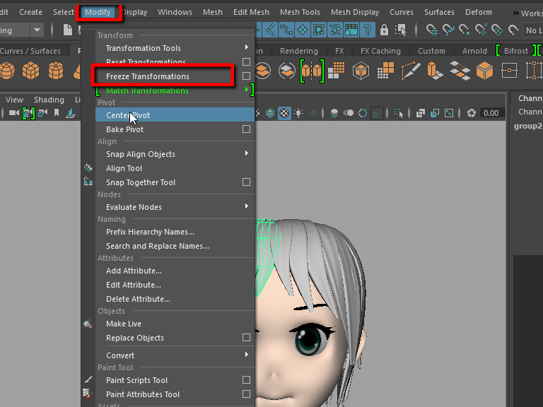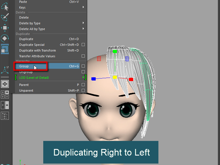 Group the right side hairs and duplicate. 画面右側の髪をグループ化し、複製します。