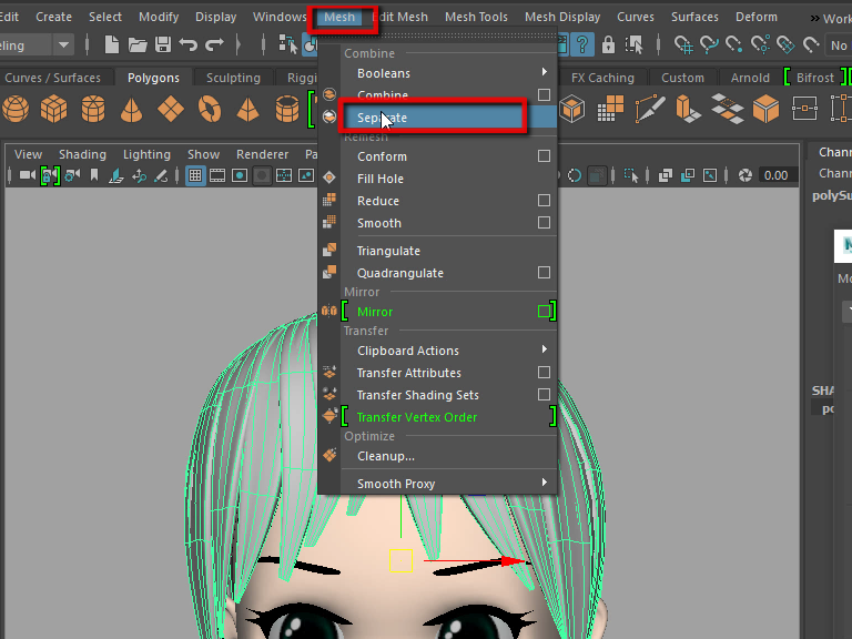 Combineされた髪を元のばらばらに戻すには Separate で。
